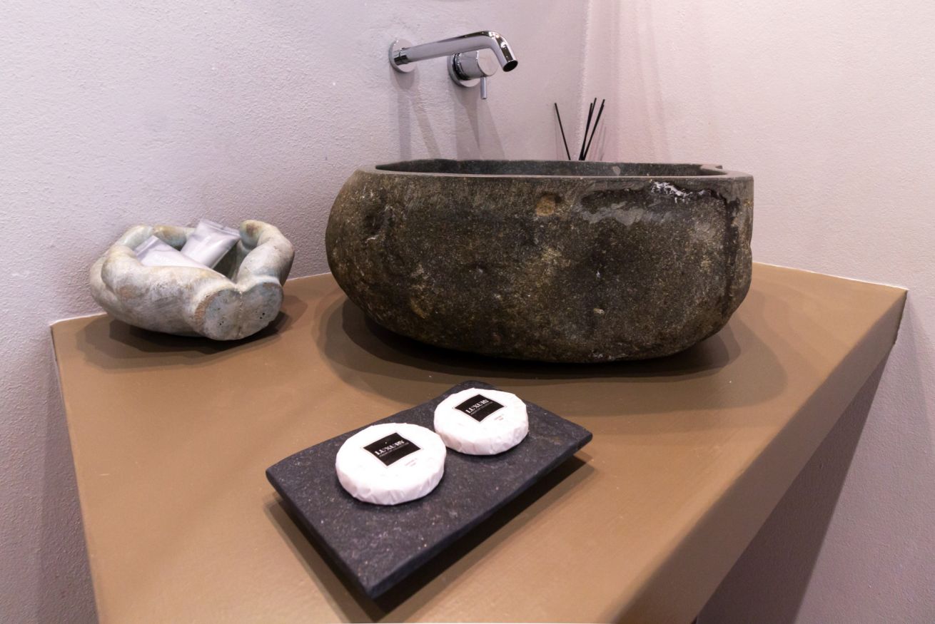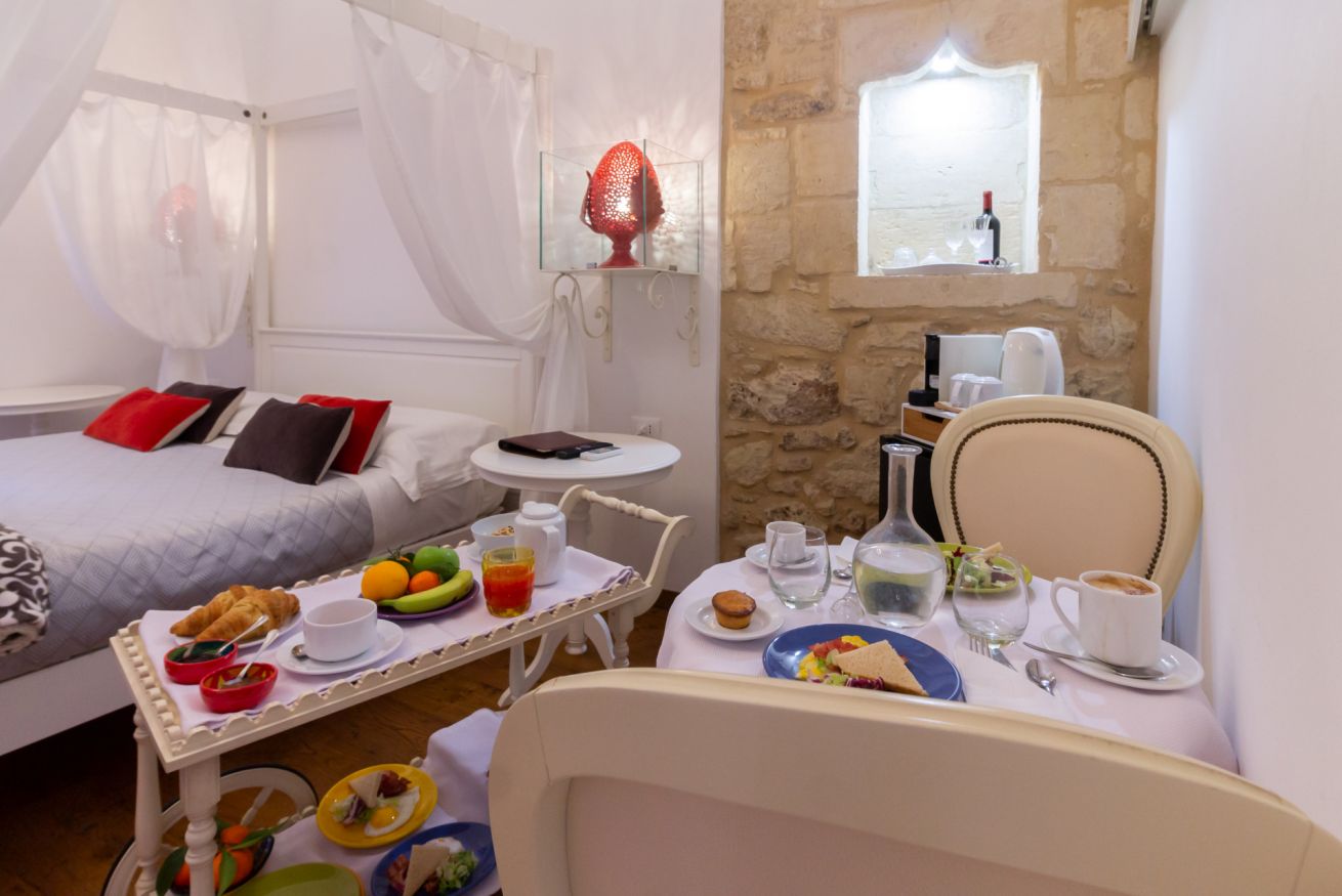 Arredamento in legno di colore bianco, dal design elegante e contemporaneo. Letto a baldacchino, impreziosito da lampade in ceramica salentina (c.d. "Pumi"), cabina armadio.Doccia king size con cromoterapia, 2 soffioni, getti laterali idromassaggio, vista camera con sistema oscurante scorrevole.Balconcino esclusivo.