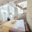 I pavimenti in parquet piallato a mano convivono perfettamente con la pietra leccese di pareti e nicchie riscoperte durante le opere di ristrutturazione.